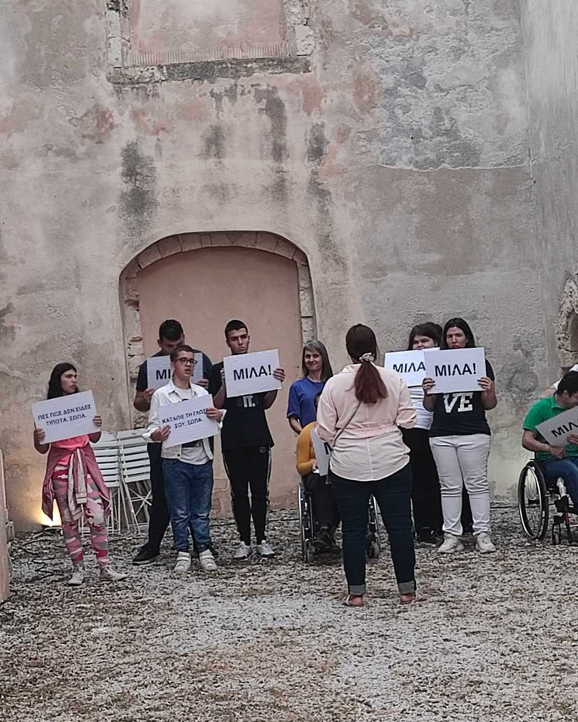 Στον παράπλευρο χώρο του Αγ. Φραγκίσκου, που παραχωρήθηκε ευγενικά από την Εφορεία Αρχαιοτήτων Ρεθύμνου αναρτήθηκαν ταμπέλες και μηνύματα για τα ανθρώπινα δικαιώματα, έγινε μια καλλιτεχνική παράσταση διαμαρτυρίας για τα άτομα με αναπηρία που συχνά η κοινωνία τα θέλει να …σιωπούν…